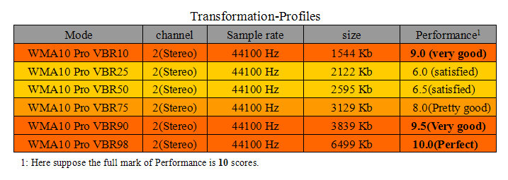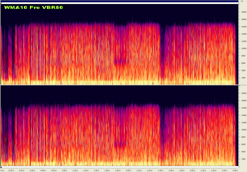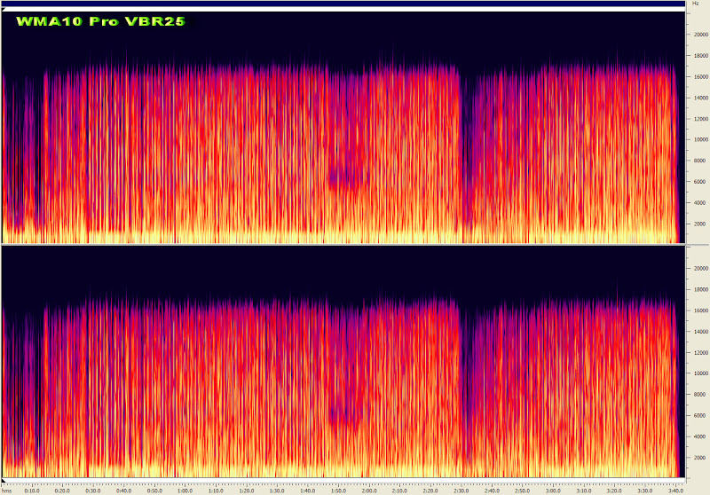As we can see, the WMA10 Pro VBR10 performanced very well at small size(Only 1544Kb), surprisingly for the VBR25 and VBR50 mode I could only say, it is barely enough. However, some improvements at VBR75 mode comparing to VBR50 are still remarkable. The VBR90 mode has brought a nearly excellent performance with small size(3839Kb) and even at VBR98(at best VBR mode) it has shown the perfect wave with size 6499Kb which surely can be accepted by a lot of music fans, in fact, it is a great news for them, especially for the guys who don't have much space in harddisk! (100 CDs (about 1000 Songs) in Flac or Ape format eat up at least 20G! but in WMA10 VBR98 mode, it could be 5G!)